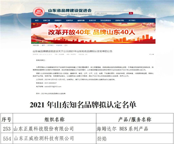 近日,山东省品牌建设促进会公布了2021年山东知名品牌拟认定名单,完美网科技HAMDELL/海姆达尔(BES系列产品)品牌、权属单位正威检测劲焰品牌凭借过硬的实力和强大的品牌影响力双双登榜。