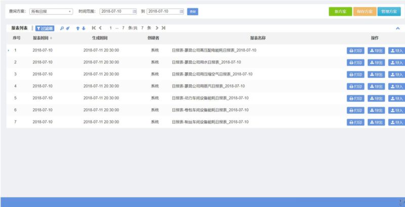 系统提供报表自定义工具,用户可根据管理的需求自定义报表内容、格式、生成周期、导出/发送规则。报表内容包括所有区域能耗、设备能耗数据,以及能源消费机构等。可根为管理决策和能源审计提供数据支撑。