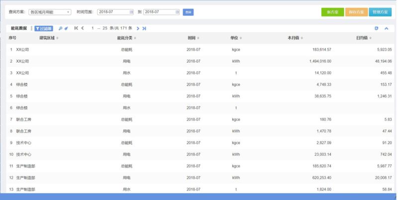 功能介绍:此功能主要满足用户对设备的历史能耗进行多角度查询的需要,允许用户自行定制查询条件,并支持自定义查询方案的编辑,手动录入和自动计算的数据都在查询的范围之内。