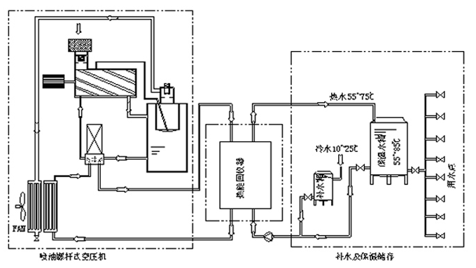 原理:回收空压机冷却水,集中到蓄水池。通过板换回收余热。