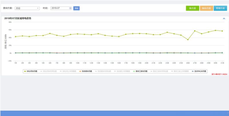 功能介绍:满足用户对企业各区域能耗的历史数据进行多角度查询的需要,允许用户自行定制查询条件(包括自定义区域、自定义能耗类型、自定义时间频率、自定义数据类型等),并支持自定义查询方案的编辑,手动录入和自动计算的数据都在查询的范围之内。
