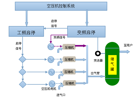 空压机在工作中,由于负载的不稳定导致供气管网压力的波动,进而导致空压机的频繁加卸载。而空压机卸载不产气的同时会消耗满载能耗的70%的能耗。空压机节能控制系统利用智能算法,控制空压机运行,使空压机匹配负载、按需供气。