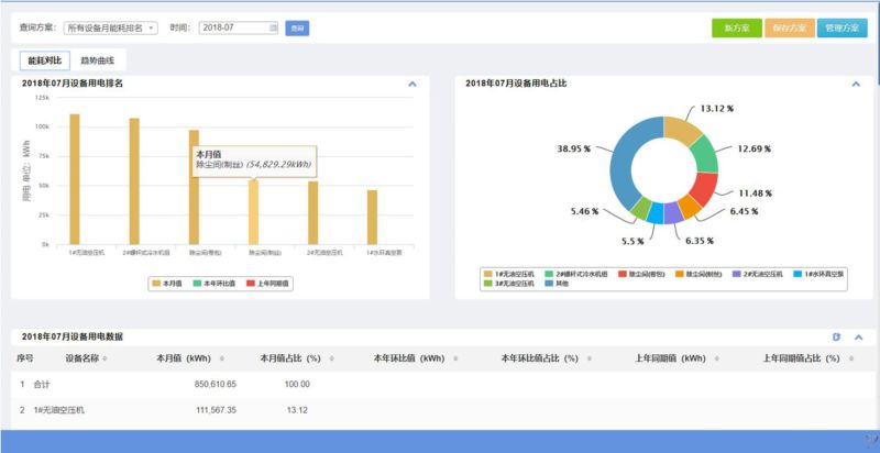 从界面中我们可以看到,所选设备的某一能耗分类本期值和同期值进行比对分析,包含内容:各设备能耗排名柱图、各设备能耗占比饼图、各设备能耗数据列表。